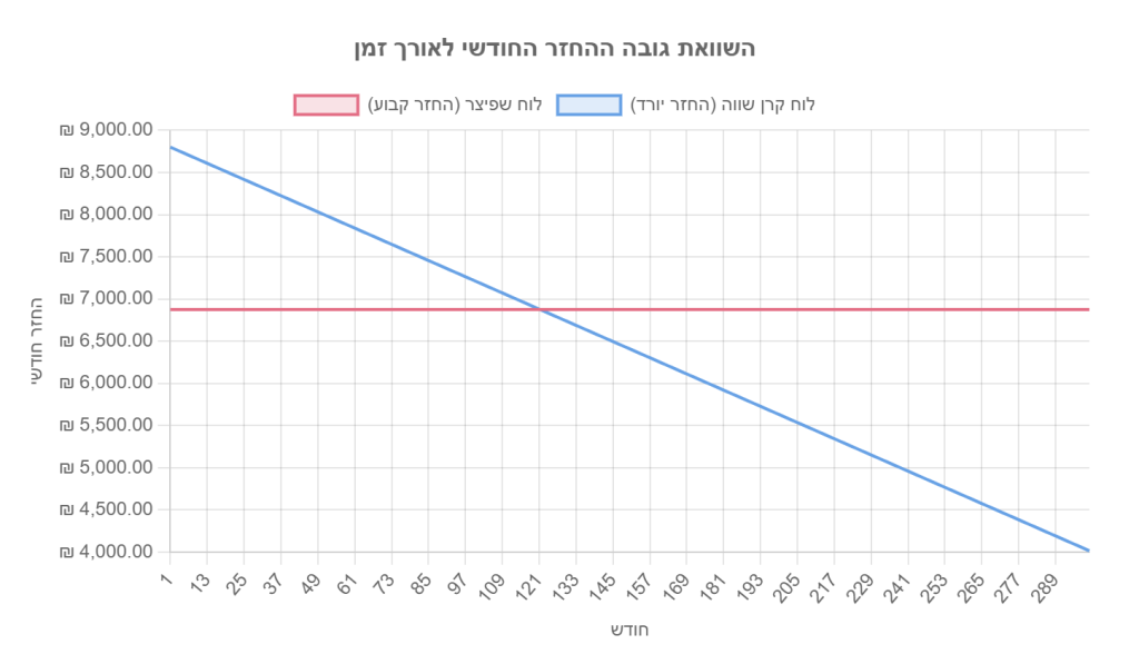 איור 2: השוואת גובה ההחזר החודשי לאורך זמן. בשפיצר ההחזר קבוע, ובקרן שווה הוא יורד.